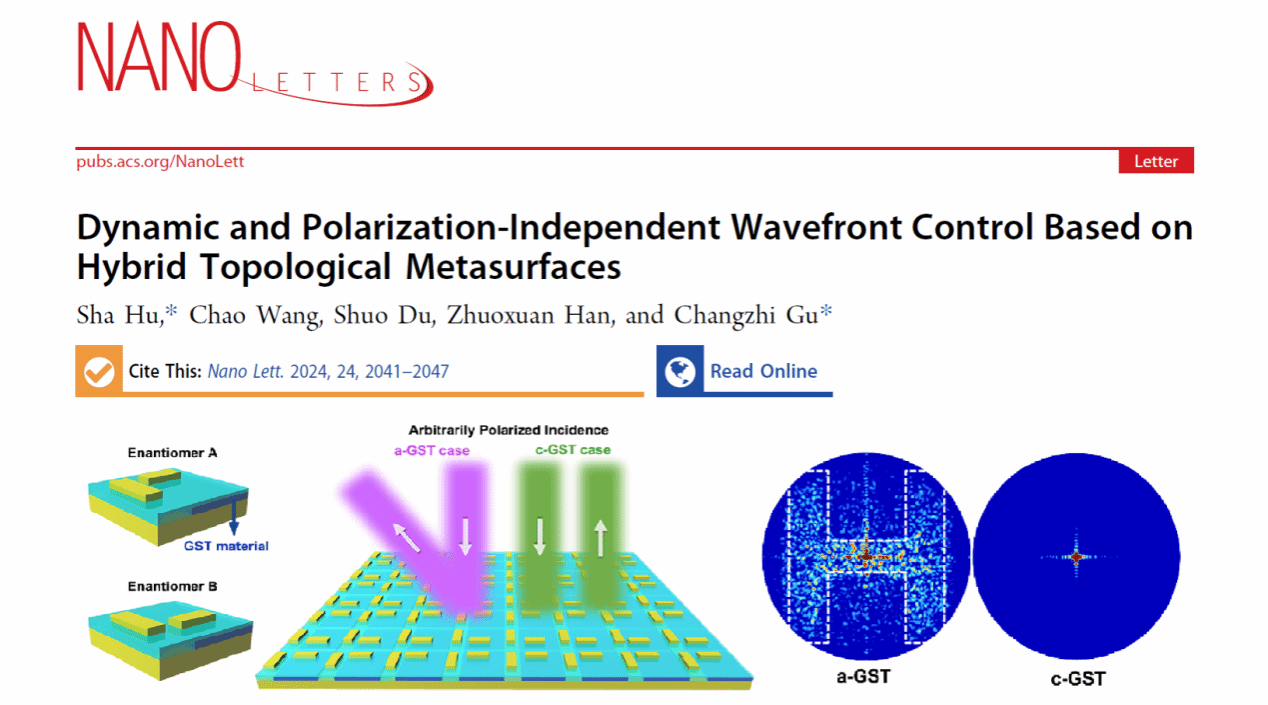 近日,我校51动漫 青年教师胡莎博士在纳米科技领域国际顶级期刊《Nano Letters》(中科院一区TOP,IF = 10.8)上发表了题为“Dynamic and Polarization-Independent Wavefront Control Based on Hybrid Topological Metasurfaces”(DOI: 10.1021/acs.nanolett.3c04621)的研究型论文。胡莎博士为论文的第一作者和第一通讯作者,中科院物理所顾长志研究员为共同通讯作者,51动漫 为第一署名单位和第一通讯单位。