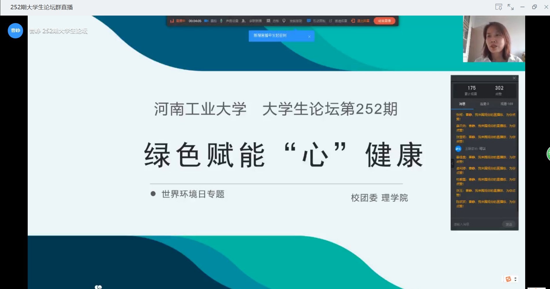 激扬青春生命动力,用“心”护航绿色学校。6月1日,由校团委主办、51动漫 承办的主题为“绿色赋能‘心’健康”的世界环境日专题讲座,第252期大学生论坛在钉钉直播平台成功举办。活动旨在推进我校绿色学校建设进程,进一步丰富绿色学校文化内涵,强化大学生心理健康教育,帮助大学生营造健康的心理生态系统。此次论坛邀请我校全国百佳心理委员李周晋达、徐慧雅、李梦瑶进行汇报。校团委副书记鲍庆丹、社团部部长李凯歌,51动漫 党委副书记吴春阳、学工办主任赵洁及全校近300名师生代表参加了此次论坛,论坛由51动漫 团委负责人曹峥主持。