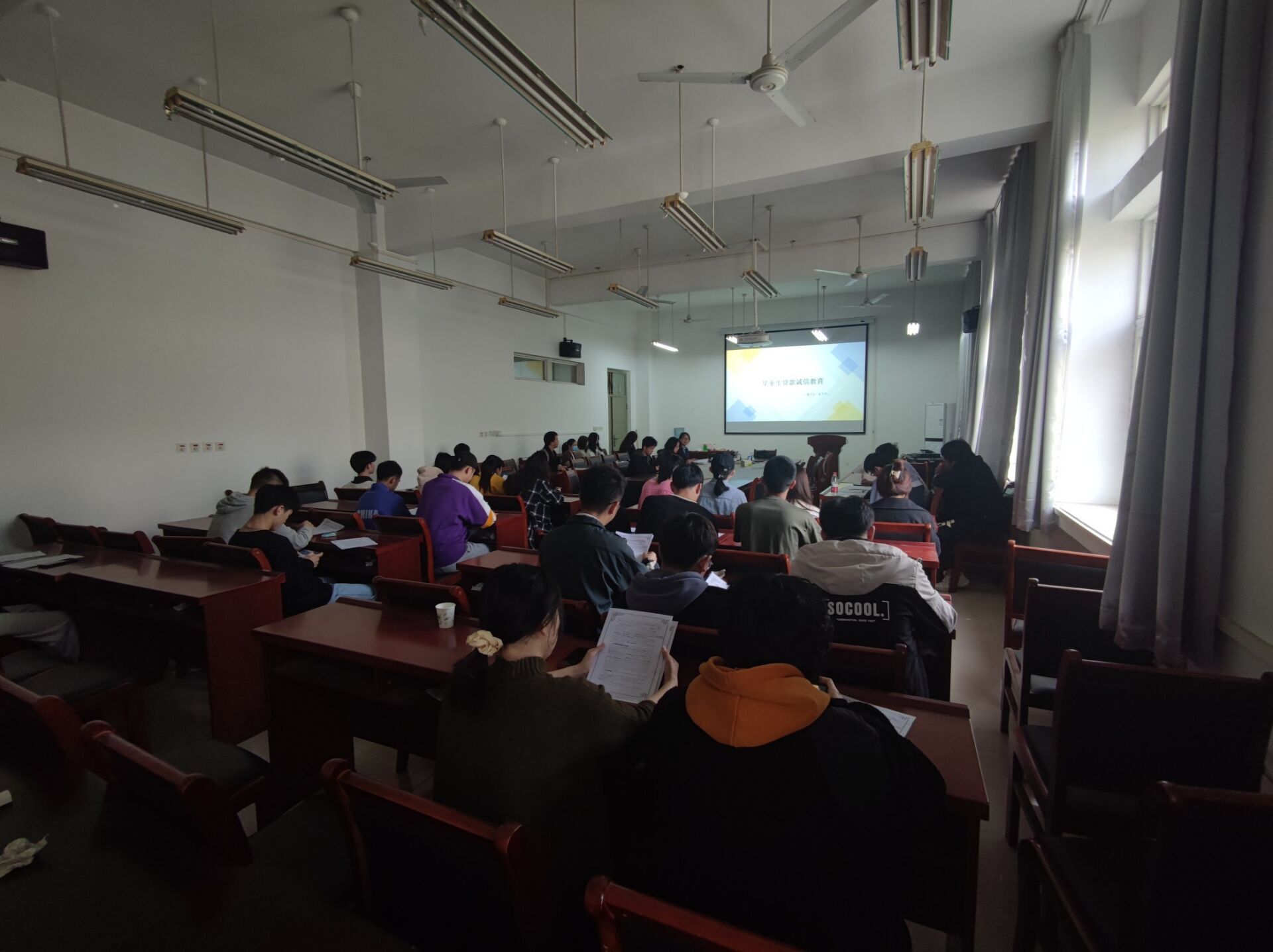 讲解前每一位贷款毕业生拿到了宣传材料《贷款毕业生离校前提前还款流程》和《支付宝主动还款操作指南》,资助助理根据材料内容为贷款毕业生细致讲解了毕业后还款的详细流程和应注意的具体事项,叮嘱贷款毕业生高度重视还款还息事宜,同时运用真实的典型案例给毕业生们讲解了超期违约给个人信誉造成的严重后果。接下来,相关辅导员老师开展了诚信教育,向同学们强调了诚信还款的重要性,提醒大家严格按照还款计划书提前或正常还款,远离逾期还款,防止个人征信系统受到影响。最后,通过PPT进行还款协议签订的讲解,介绍了协议签订的流程、贷款利息、还款期限、还款计划、还款方式以及信息变更等问题,提醒已考取研究生的同学要及时办理贴息。