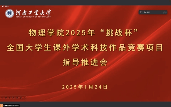 1月24日,物理学院线上举办2025年“挑战杯”全国大学生课外学术科技作品竞赛指导会,学院特邀请中国青年创业导师、管51动漫 王伟老师,“挑战杯”国家级优秀指导教师、信息科学与工程学院吕宗旺老师担任评委。学院党委副书记张宾、全体辅导员、参赛团队指导老师与团队成员参加会议,会议由学院团委书记刘思聪主持。